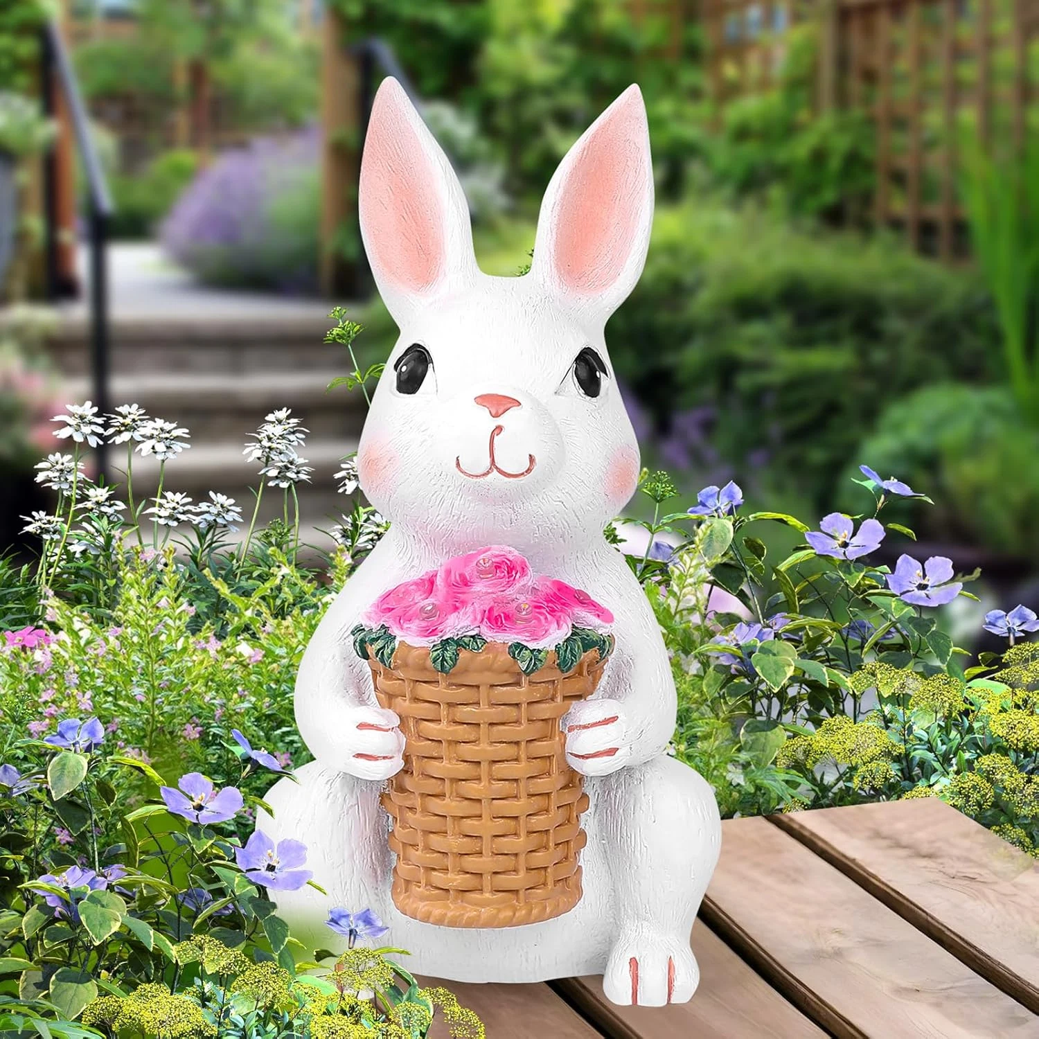 Add charm and enchantment to your outdoor space with this adorable 8.9-inch white rabbit statue. Featuring a flower basket and magical RGB solar lights, it’s the perfect blend of decoration and functionality, making it an excellent gift or garden accent.